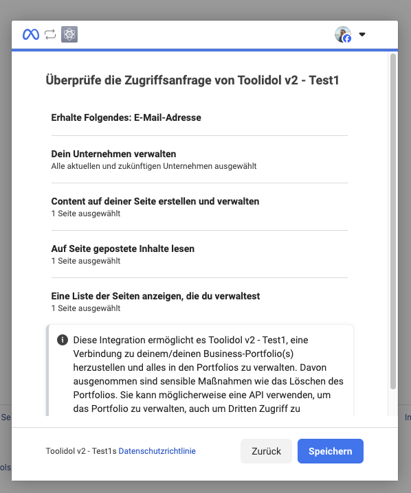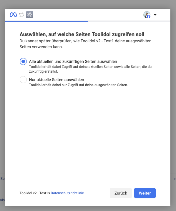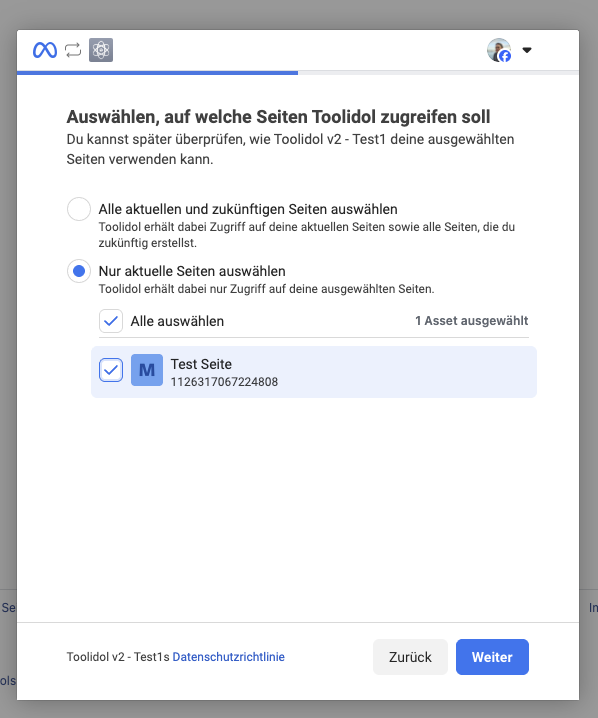 Nachdem die Verbindung hergestellt wurde, musst du nun noch eine spezifische Seite auswählen, auf welcher Toolidol Inhalt veröffentlichen soll.