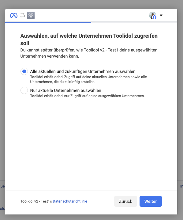 Anschließend kannst du noch auswählen, auf welche verbundenen Unternehmen Toolidol zugreifen kann