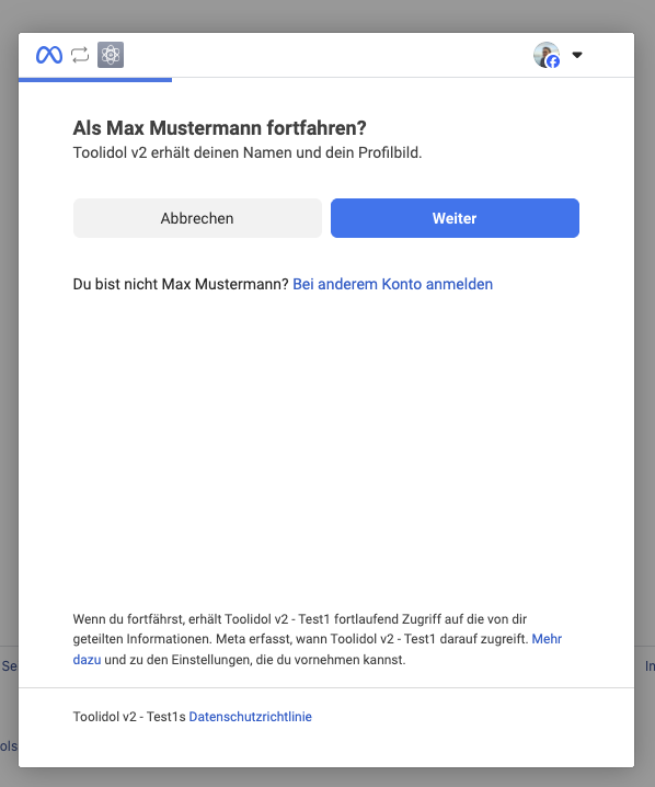 Bei Facebook musst du anschließend bestätigen, als welche Person du fortfahren möchtest